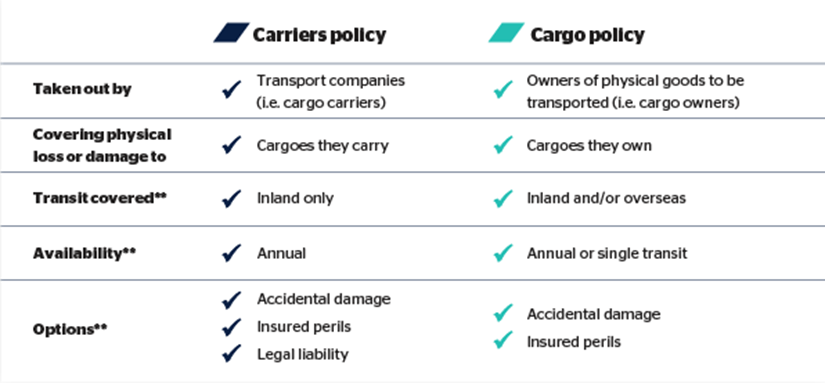 Both policies protect goods against physical loss and damage. The key difference is who takes out the policy and who it protects. In short, cargo owners hold cargo policies and transport operators hold carriers policies.